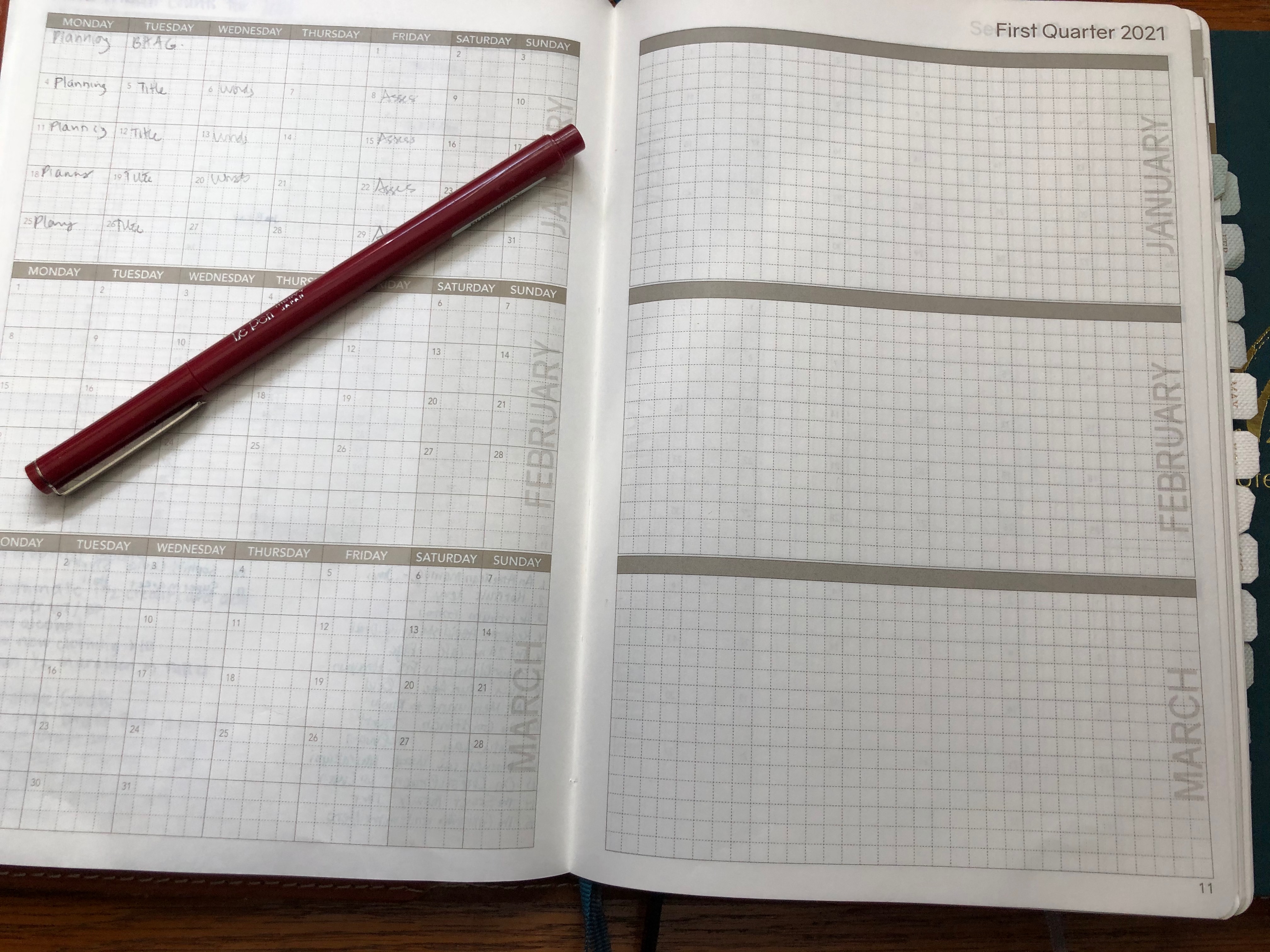 Game changer again. It’s actually two books, a planner with places for yearly, quarterly, and weekly planning, and then numbered grid pages for either daily pages or other types of collections. The second book is a numbered grid notebook, which is what I use for the daily pages. Both fit in a nice leather cover that I had for my Rhodia Goalbooks. The W222 is like the Goalbook on steroids. If nothing else, 2021 will be well planned for me.