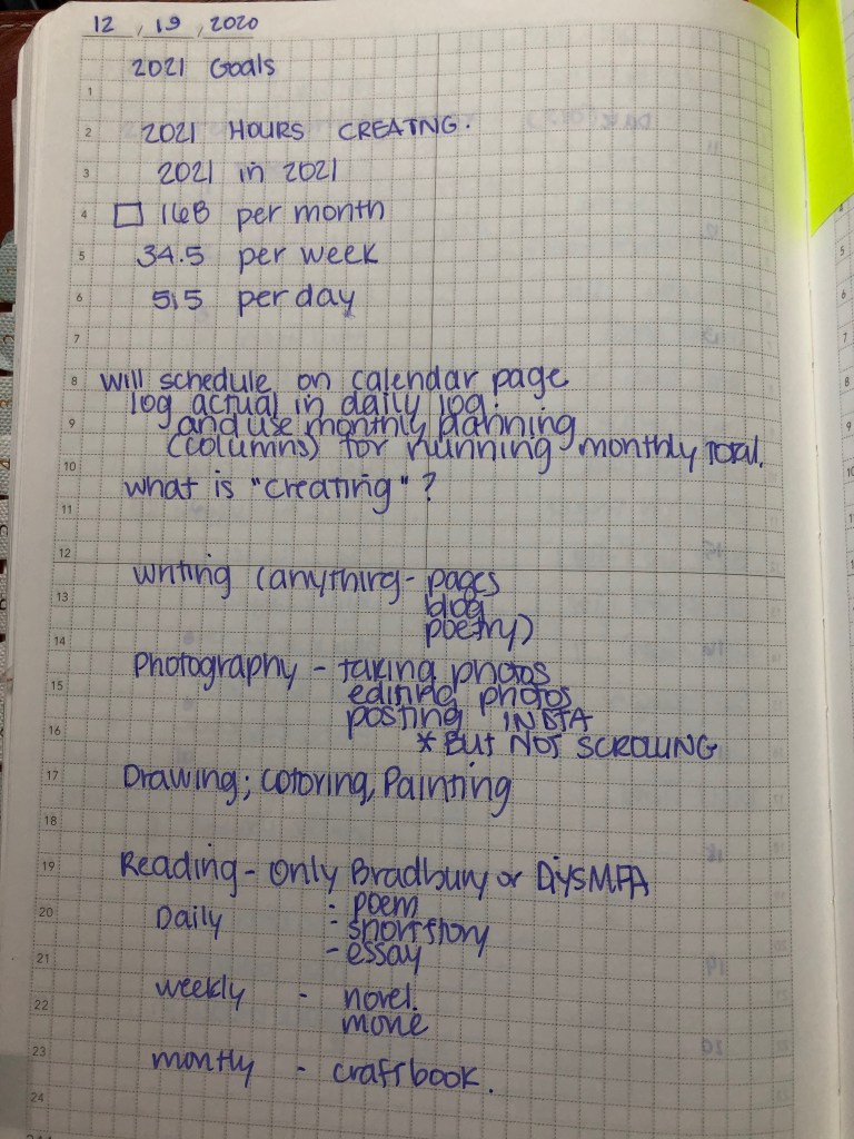 I have some pretty BHAG (Big Hairy Audacious Goals) this year. So starting early is a good thing. The biggest, scariest, maybe not even doable goal is to spend 2,021 hours in 2021 creating. That works out to 5.5 hours a day for the whole year. That is a scary number, it makes creating a part time job. And I have a day job that is usually 8 hours a day. So, my planner is going to be my sidekick each morning as I try to fit those 5.5 hours in somehow each day. (on the plus side, I will have weekends to catch up/get ahead).