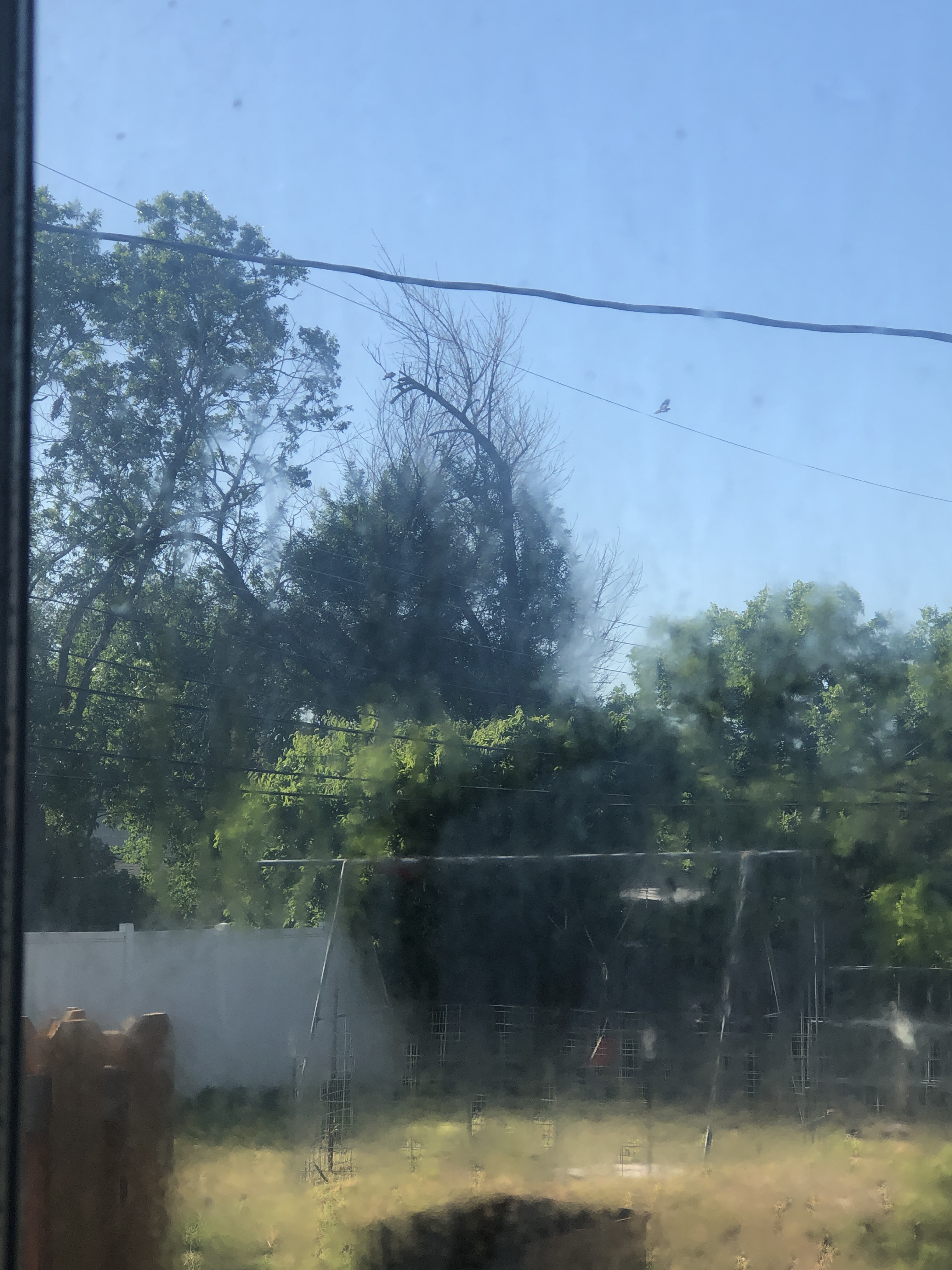 The sun shines outside the window the blue sky clean and clear Water from the sprinklers runs down the glass blending the colors as a living watercolor painting