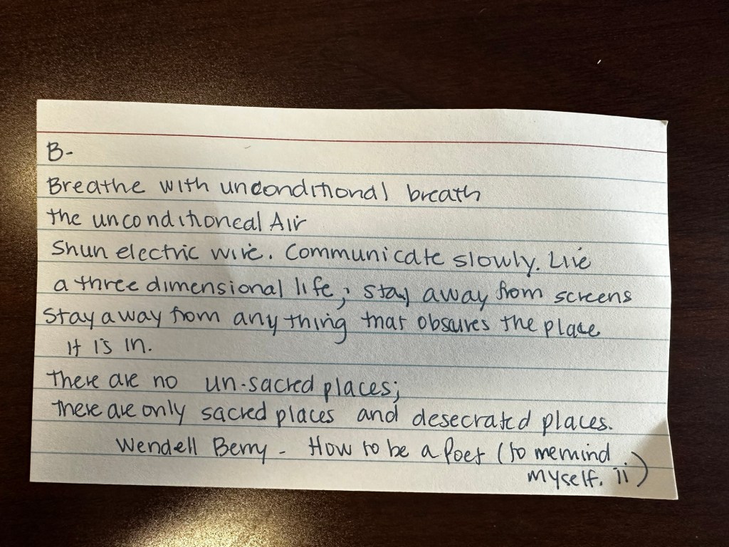 The commands of this poem are harsh, and could be judgmental, if one ignores the subtitle. Berry wrote this simply to remind himself. But in reminding himself, he woke up the poet that lives in all of us.