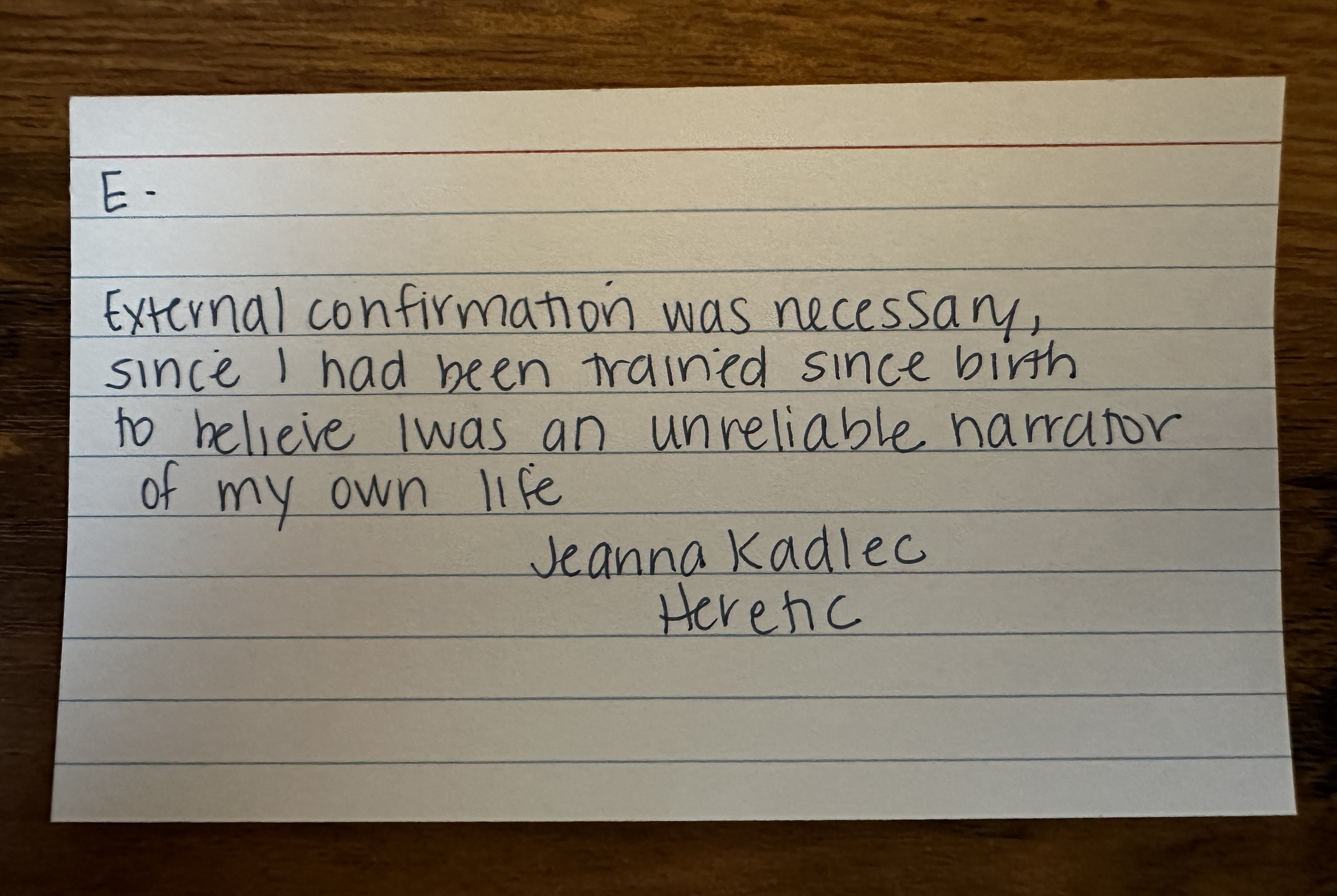 External confirmation was necessary since I had been trained since birth to believe I was an unreliable narrator of my own life.