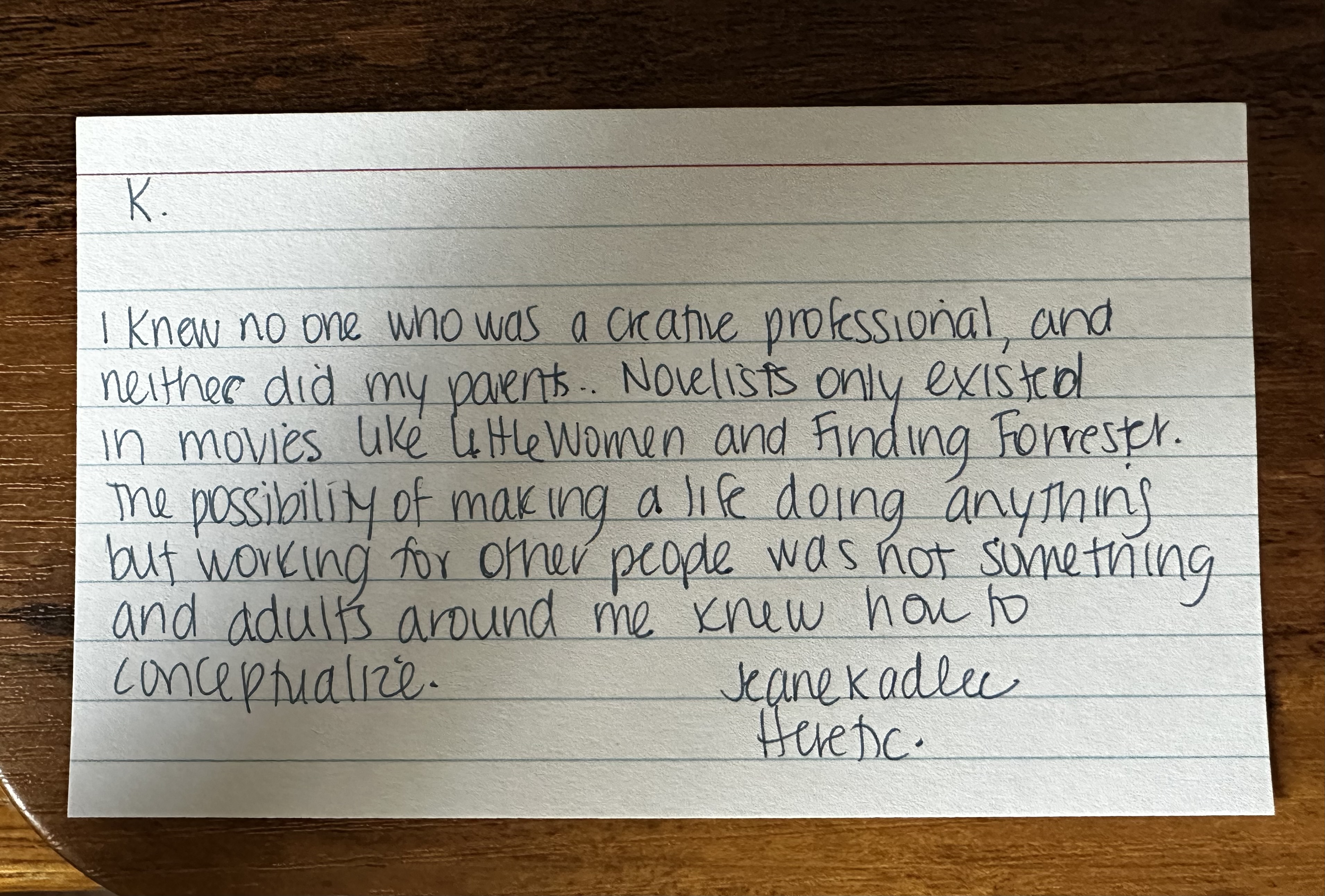 K- (i) knew now one who was a creative professional, and neither did my parents. Novelists only existed in movies like Little Women and Finding Forrester. The possibility of making a life doing anything but working for other people was not something any adults around me know how to conceptualize.
